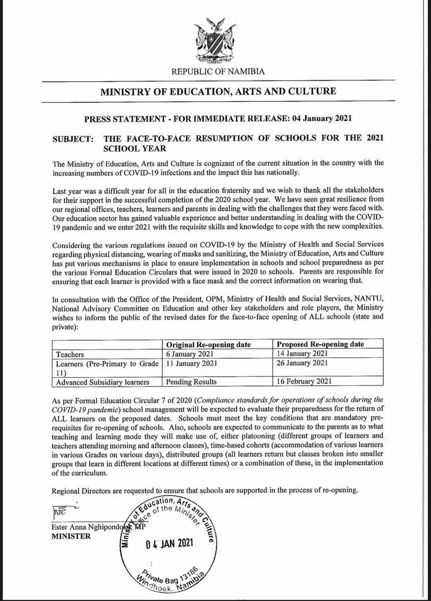 Minister of Education Arts and Culture. Following the Presidents announcement confirming 2 COVID-19 cases in Namibia yesterday the Acting Minister of Education Mr. All rights reserved Website Designed and Developed by Omalaeti Technologies.
